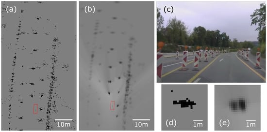The pole-like objects are not the only obstacles visible on the occupancy grid. A larger part of the grid is depicted in Figure 20. The image presents a screenshot of a short road-works section with high bollard concentration (Figure 20). The image from a web camera serves as a visual reference only. In the initial hit point, occupancy grid detections are scattered in the environment (Figure 20a). The proposed approach with tuned free space and decay shows that false positives in front of the vehicle are filtered out effectively (Figure 20b). Moreover, in the filtered output, two separate bollards close to the vehicle may be separated, which cannot be done using the basic hit point approach (Figure 20d,e).