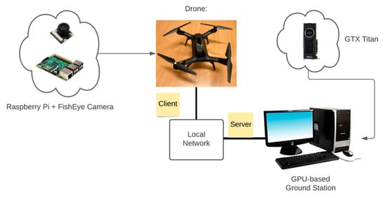 Figure 1 shows that the practical implementation of this work was done on an on-board UAV with Jetson Xavier GPU. Stand-alone on-board system is crucial, since in the wilderness we do not have network to rely on. From Sabir Hossain’s experiments [33] on different GPU systems, it was evident that Jetson AGX Xavier was powerful enough to work as a replacement of ground station for a GPU system. This is the reason why the Jetson Xavier GPU has been chosen. In the fourth chapter of this paper, in the experimental session, to ensure the reliable testing conditions we could not go to the field to fly the UAV for some external reasons, so we simulated the field environment in the lab and prepared for UAV motion control. The system for the testing part was changed, as shown in Figure 2. The testing part was done on a 3DR SOLO drone based on the Raspberry Pi system [34], which relies on a desktop ground station with GTX Titan GPU. The drone communicates with the computer through a local network. The comparison of the two GPUs is in Table 1 [35]. In Chapter 4 we also tested the real running time of the program on the proposed architecture.