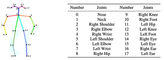 OpenPose [36] is a real-time multi-person framework displayed by the Perceptual Computing Lab of Carnegie Mellon College (CMU) to identify a human body, hand, facial, and foot key points together on single images. Based on the robustness of the OpenPose algorithm and its flexibility in extracting key points, we use it to detect the human skeleton and obtain skeletal data in different gestures of the body, thus laying the data foundation for subsequent recognition. The key thought of OpenPose is employing a convolutional neural network to produce two heap-maps, one for predicting joint positions, and the other for partnering the joints into human skeletons. In brief, the input to OpenPose is an image and the output is the skeletons of all the people this algorithm detects. Each skeleton has 18 joints, counting head, neck, arms, and legs, as appeared in Figure 3. Each joint position is spoken to within the image arranged with coordinate values of x and y, so there’s an add up to 36 values of each skeleton. Figure 3 shows the skeleton data and key points information.