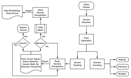 The system framework proposed in this paper is based on rescue gesture recognition for UAV and human communication. In this section, human detection, counting, and tracking are described. Body gesture recognition with set and reset functions and hand gesture recognition at close range are explained in detail. Figure 4 shows the framework of the whole system. First, the server on the onboard action unit drone side is switched on and the initial resolution of the drone camera is set. The input to the system is the live video captured by the drone‘s camera and the process is as follows: in the first step human detection is performed and when a person is detected by the drone, the system proceeds to the next step of rescue gesture recognition. In the second step, pose estimation is performed by OpenPose and the human is tracked and counted. The third step is the recognition of the body rescue gestures. Feedback from the human is crucial to the UAV rescue. The cancellation gesture idea comes from our user-adaptive hand gesture recognition system with interactive training [31]. When the user’s body gesture recognition results in Attention, the system proceeds to the final step of hand gesture recognition. If the user’s body gesture recognition is a cancellation, then the system switches off directly and automatically. The system uses gesture recognition technology to force the user to communicate briefly, quickly, and effectively with the drone in specific environments.