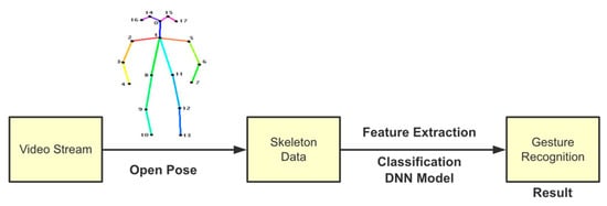 Figure 5 shows the flowchart for the human body gesture recognition. OpenPose algorithm is adopted to detect human skeleton from the video frames. These skeleton data are used for feature extraction, which is then fed into a classifier to obtain the final recognition result. We make the real-time pose estimation by OpenPose through a pre-trained model as the estimator [44]. OpenPose is followed by Deep Neural Network (DNN) model to predict the user’s rescue gesture. The Deep SORT algorithm [45] is used for human tracking for the multiple people scenario. The main reasons for choosing this latest method are as follows. Human tracking is not only based on distance and velocity but also based on the features that a person looks like. The main difference from the original SORT algorithm [46] is the integration of appearance information based on a deep appearance descriptor. Deep SORT algorithm allows us to add this feature by computing deep features for every bounding box and using the similarity between deep features to factor into the tracking logic.