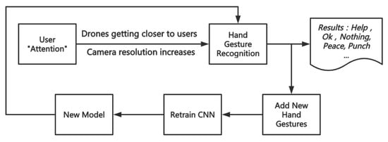 Figure 6 shows the flowchart regarding this section. Hand gesture recognition is implemented by using a convolutional neural network (CNN) [53]. The 12-layer convolutional neural network model is compiled using Keras with TensorFlow backend. The CNN model can recognize 5 pre-trained gestures: Help, Ok, Nothing (i.e., when none of the above gestures are input), Peace, Punch. The system can guess the user’s gesture based on the pre-trained gestures. A histogram of real-time predictions can also be drawn. The combination of recognition of overall body gesture at a distance and hand gesture at a close distance makes drone rescue more comprehensive and effective. Although the gestures that can be recognized at this stage are limited, the system can also capture and define new gestures given by the user as needed and get a new model by retraining the CNN. As an example, we can add the recognition of numbers by human hand gestures as described before in Section 2.3, when the body gesture recognition in the previous section results in a PhoneCall, at which point the two can be used in combination, and the user can provide the drone with the phone number to be dialed via hand gesture recognition, thus also allowing for rescue purposes.