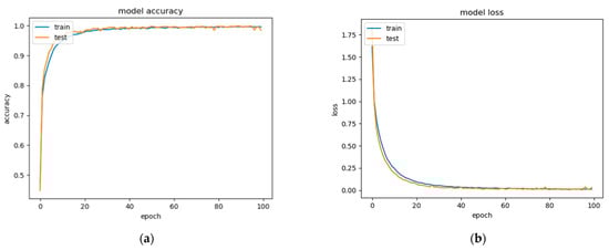 Based on the body rescue gesture dataset created in Table 3, we trained the model through a deep neural network to finally obtain the accuracy and loss of the body gesture recognition model. The changes in accuracy and loss function are shown in Figure 8 over the course of training. At first, the training and testing accuracies increase quickly. Afterward, slow growth between 10 epochs and 20 epochs and merging happens after 25 epochs. The accuracy and loss approach to their asymptotic values were seen after 40 epochs with minor noise in between. The weights of the best fitting model with the highest test accuracy are preserved. Both, training as well as testing loss diminished consistently and converged showing a well-fitting model.