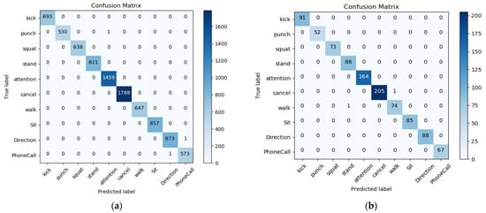 Confusion matrix with predicted labels on X-axis and true labels on the Y-axis tested on body gesture training set (a) and in testing dataset (b).