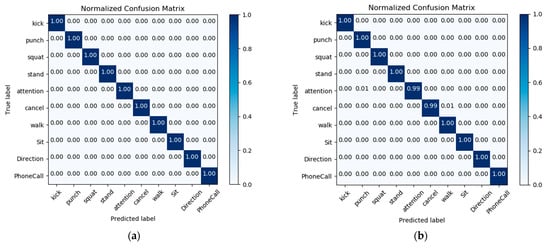 Standard matrix with predicted labels on X-axis and true labels on the Y-axis tested on body gesture training set (a) and in testing dataset (b).