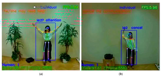 Figure 11 shows the recognition of the Cancel gesture and Attention gesture with warning messages in real-time. Figure 11 also gives information about the number of people, time, frame, and FPS. Next are the recognition display and detailed description of two basic gestures that we randomly selected from the dataset. In Figure 12, the diagram on the left shows us that when a user points in a specific direction, the purpose is to alert the drone to look in the direction the person is pointing to. For example, when the direction pointed has someone lying on the ground, this gesture solves the problem that when somebody lying on the ground, UAV cannot recognize the skeleton information about the lying person well due to flight position of the drone. Direction gesture is also helpful to the fainted or unconscious people, when there is a group of people, those who have motion can use the Direction gesture to give instructions to the drone to save those who cannot move. Practically, as the main issue, our proposed system is for helping people in a bad situation, but we do not want to disturb persons who do not want or could not interact. The on-board system may send messages to the central about non-moving people, but we leave them in peace if they simply have a rest. In Figure 12, the diagram on the right shows the user’s gesture to make a phone call, which can be linked to hand gesture number recognition at a later stage. When the user poses to make a call, we can perform hand number recognition at a later stage to get the phone number the user wants to dial.