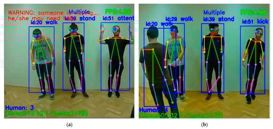 During the human body gesture recognition, Attention and Cancel are dynamic gestures that function as set and reset respectively and should therefore confuse the UAV board recognition during the frame-by-frame check. When either of these two gestures is detected, the system will immediately give an alert. Figure 13 shows that when there are multiple people, one of them sends an Attention gesture to the drone. At this point, the drone sends a warning to inform that someone needs help. We can also see in Figure 12 that other people’s gestures are well recognized in addition to the person making the Attention gesture. In our recognition system, about 10 people can be recognized at the same time during human body gesture recognition. Figure 13 also shows the basic gesture recognition of multiple people without warning. We can see some people standing, some people walking, and some people kicking. Also, the number of people, time, frame, and FPS will be displayed. It should be noted that if a person is not fully present in the drone camera, then it will not be recognized. People’s movements are generated continuously in real-time, and Figure 13 is a photo we took from the video, so there will be some inaccurate skeleton information. Of course, if a person’s gesture is not in our dataset, that person’s gesture will not be recognized and the recognition result information above it will be blank.