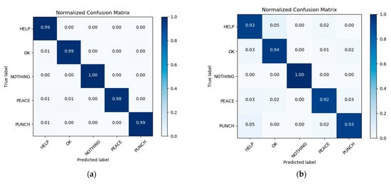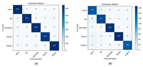 Standard matrix with predicted labels on X-axis and true labels on the Y-axis tested on hand gesture training set (a) and in testing dataset (b).