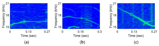 - Ahn, J.M.; Lee, H.J.; Kim, Y.C.; Lee, S.K.; Chung, J.H. Mimicking dolphin whistles with continuously varying carrier frequency modulation for covert underwater acoustic communication. J. Jpn. Appl. Phys. 2019, 58, 1–10. [Google Scholar] [CrossRef]