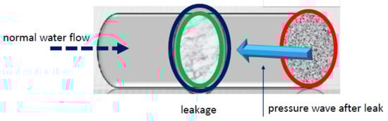 Leak detection by means of spectral analysis is one of the most important techniques which does not require important instrumentation and equipment. It requires one or more sensors to be mounted on the pipe, allowing to acquire an electric signal that corresponds to the amount of vibrations due to normal liquid flow and sudden peaks connected to leakage. The mechanism of leak detection is explained in Figure 1. The regime of normal flow does not affect the operating mode of the water transportation. In the event of leakage, there is a reverse flow that opposes the normal flow and determines a leak, as reported in the figure. The established transient produces a series of vibrations that are converted to a spectrum. This transient is like a decaying process as it is noticed in nuclear magnetic resonance (NMR) and ionizing radiation. This similitude justifies using algorithms fitted for this process to better recover the signal considering that the pipe is similar to a vein or artery that undergoes thrombosis or a stroke that may affect the regular regime of blood flow. In fact, this is a recent field of research denoted as health hydrology, similar to formal hydrology.