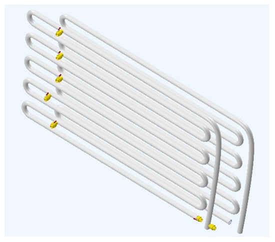 Detection of leakage through spectral analysis using sensor data processing is applied here to an experimental and zigzag hydraulic circuit hanged on a wall at a laboratory (Measurement and Instrumentation Laboratory, University of Salento, Italy). The plant consists of two juxtaposed circuits (see Figure 3): the first is for 70 m, and the second for 50 m. The hydraulic circuit has 11 water taps for simulating leaks. These water taps are opened and closed manually. The architecture of the experimental plant reflects an extreme case of common waterworks and water distribution systems for drinking water and agricultural uses, respectively. In fact, it is composed of two main parts: an ascending part for around 70 m, and a descending one for 50 m. Both parts are zigzagged as a serpentine with a section of 1 inch. The pipes are fixed on the wall by means of a bracket with a little stack to allow the pipe to vibrate. As indicated before, this is an extreme configuration. There is a permanent vibration that, even though low, can increase when the pipeline, considered free of water at the beginning, is supplied with pumped water, in case we reach the highest vibrations when free of water until the hydraulic circuit is full of water.