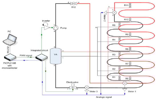 The plant, as illustrated in Figure 4, contains the following main elements: (i) a 120-m pipeline, manufactured in double stratum-based copper, hanged on a wall of the laboratory; (ii) three pressure sensors at a specific distance; (iii) 11 water taps serving as intentional leaks along the pipeline; (iv) a water tank; (v) an acquisition system with proper electronics; (vi) a pump with a dedicated inverter for speed variations; (vii) a computer.