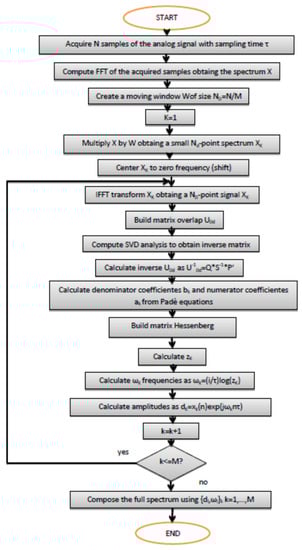 The function  is also an operator, with eigenvalues  and eigenvectors . To show how the algorithm works, it is necessary to modify the specific transform (FFT, STFT, DSD, FDM, DPA) to be adapted as an algorithm by defining a complex one-dimensional signal in time domain , defined in a set of equidistant time intervals  as a sum of damped sinusoids [],