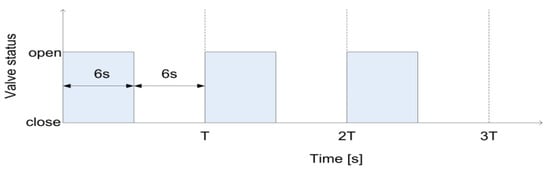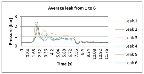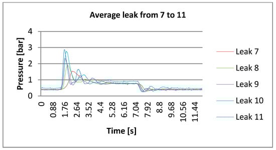 Any detection algorithm, especially based on spectral analysis, relies on uncertainty in revealing the correct position, accuracy, spectral resolution and the time between the leak occurrence and its detection—that is, the response time. The latter, on equal terms with respect to FDM, DSD and DPA, is also a critical parameter. To understand this reasoning, Figure 15 traces out the time of the opening and closing of the electrovalve after the pump that allows to modify the flow conditions; 12 s is the duration of opening and closing. The pump (an Ebara CMA 0.50M []) displays a maximum pressure of 6 bar and a flow rate ranging from 0.333 up to 2.333 L/s. Conversely, the sensor measurement range is 0–10 bar.
