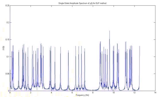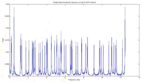 From this range, in particular, 1.452 Hz is the right frequency allowing to detect, with major reliability, the leak. Then, as Figure 11 displays, we are able to reveal the right peaks (only these ones) corresponding to the opening of water taps. Since there are two joined zigzag pipelines (one ascending with leaks from 1 to 6 for 70 m), analogously, in Figure 10, the spectrum, through DLP, of the time domain representation of leaks from the 7th up to 11th water tap is reported. Hence, with the detection of leaks, for a descending branch, from the end of the first one, for 50 m to work as one pipeline, DLP exhibits the same range of magnitudes in both cases. The leaks are reported in Figure 12.