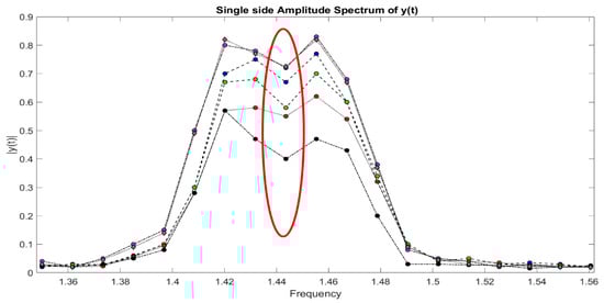 It is related to the lower accuracy in the recovery of the peak, which is less pronounced due to the lower amplification of the wave; this situation can be interpreted as a higher percentage of noise in the spectrum. Figure 2 illustrates the summation and then the comparison between two different series of waves. The first (top left) is the theoretical spectrum, simulated as it is described in the testing section, to be overlapped with the second one (bottom left) so that the result brings overlapped spectra, depicted in the right. One can see that there is no coincidence or total overlapping in a specific window. This lack of overlapping is exactly the leak. The distance between the lower peak and the higher peak in the circled window is a strong indicator of the noise included in the processing. For the conventional techniques such as FFT, TFT, wavelets, etc., this distance is higher than in the newer aforementioned techniques. In practice, this means resolution and immunity to noise.