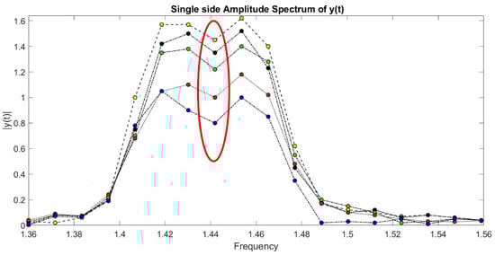Between 1.4 and 1.5 Hz, according to Figure 9 which represents the results of DLP processing of all signals in the time domain of leaks from 1 to 6, there is an interesting peak, the highest, that enables the best detection of the leak corresponding to water tap opening. The same reasoning is also done for Figure 10.