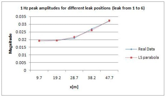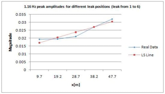 The results shown in Figure 6 and Figure 7 are related to the entire pipeline composed of two joined sections of 70 and 50 m, respectively. They are cognate irrespectively of the magnitudes retrieved at the aforementioned frequency, namely 1.452 Hz. Moreover, to calculate the position of the leak with respect to the close pressure sensor, it is viable to find it using an uncertainty approach. Regression, notably linear and/or quadratic, can help accordingly. In linear regression, for instance, using ordinary least squares [], it is necessary to calculate coefficients a and b so that the line of the subsequent equation has a minimum distance to given points: