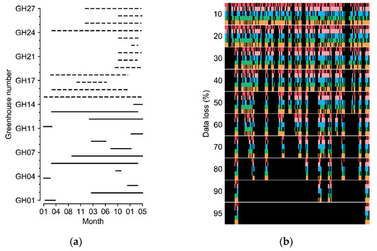 (a) Cultivation periods of the greenhouses. Solid and dashed lines represent tomato and sweet pepper greenhouses, respectively. (b) Examples of manipulated data loss. Each color from the top represents five target factors of internal temperature, external temperature, internal relative humidity, internal CO2 concentration, and radiation. Black blanks represent the data loss. Refer to Table 1 for the units of environmental factors.