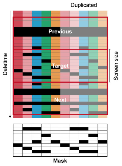 Diagram of data preprocessing for U-Net. Each color represents each environmental factor. Each color from the left to right represents the five target factors of internal temperature, external temperature, internal relative humidity, internal CO2 concentration, and radiation. Black cells are missing data. The values in a mask were 0 and 1 for black and white, respectively.