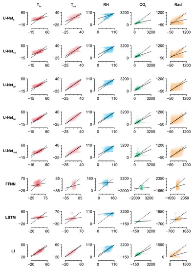 The accuracies of the trained U-Nets increased with screen size, but U-Net100 exhibited lower accuracy than U-Net50. The values imputed by U-Net100 tended to be biased, which could indicate overfitting (Figure 4). Aside from the U-Nets, LI had the highest accuracy for imputation of the missing data. Similar to the U-Nets, the highest prediction accuracy was obtained with Tout, while the lowest was obtained with Rad. This result contrasts with the high imputation accuracy for radiation obtained by the trained U-Net50. The FFNN and LSTM did not exhibit competitive accuracies, although they are deep learning methodologies. According to the R2 values, they could not relate the remaining intact data with the missing data.