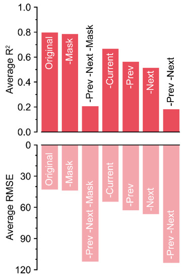 Because the R2 values decreased by almost 0.6 without the previous and next matrices, these matrices were the most influential input components (Figure 6).