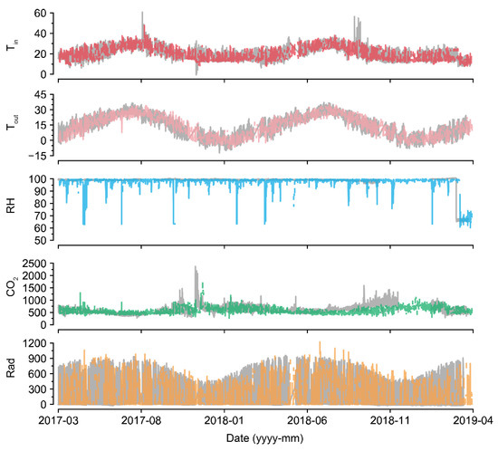 The data interval was one hour, and the collected environmental factors were internal temperature (Tin), external temperature (Tout), internal relative humidity (RH), CO2 concentration (CO2), and radiation (Rad). The collected data included erroneous values (Table 1).