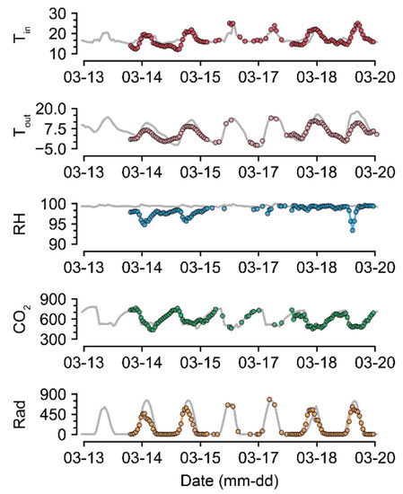 Meanwhile, the imputation of missing Tin did not exhibit as high an accuracy as in the case of Tout. The models could not impute Tin, although this factor also has somewhat constant patterns because the internal environments of greenhouses are controlled to be within specific ranges [4]. Neural network algorithms yielded high performance in previous studies [35,36]. Unlike Tout, Tin could be affected by different grower strategies [37]. Therefore, the datasets did not seem to share the changing patterns; thus, the models could not impute the missing Tin with as high an accuracy as for Tout.