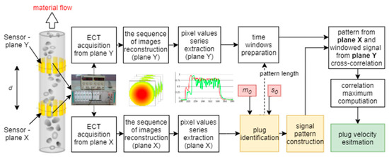 The flow velocity measurements are often applied to many industrial processes, such as food, mineral, chemical, and pharmaceutical production [1,2,3,4,5]. For one phase flow, velocity measurement is a relatively simple task. However, it is still challenged in multiphase flow applications when the velocity measurement of the chosen phase is required. One of the concrete applications is plastic bottle production, where a pneumatic transport system transports granular material. One of the basic efficiency criteria for such a transport system is the maintenance of low air pressure during material propagation. Thus, continuous measurement of solid material velocity is necessary for estimating the transportation efficiency of such a system. Nowadays, in practice, different techniques for the flow velocity measurement are used, although they are still not perfect. Sometimes, invasive techniques are used. They require sensors inserted into the pipe, and as a result, they disturb the material propagation and are exposed to abrasion over time. There are also laser methods and other optical methods, but they have a limited scope of application related to its radiation issues.