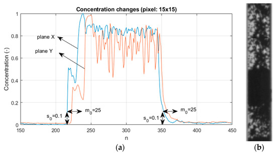 Normalized concentration changes within a chosen pixel (15,15) of the tomographic images (a) and the image captured by a high speed camera (#220–#320) (b); s0—some threshold level and m0—the arbitrarily chosen number of frames.