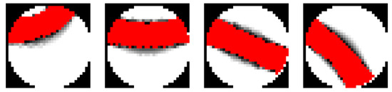 One of the ECT data processing stages is to perform an image reconstruction algorithm that allows preparing the pipe cross-section view. There are many such methods. However, despite the lower quality, the most frequently used method in real-time systems is the linear back projection (LBP) method [25,26] due to the low cost of computing. The method of linear back projection is a method belonging to the group of inverse problem solution [27], allowing to calculate more result data than the amount of input data. This method includes calculating all points of the tomogram using the so-called sensitivity matrix. This structure is based on a predefined N-element image table, where each element corresponds to the distribution of electric capacitance between two sensor electrodes. Part of the sensitivity matrix with example pairs of electrodes are shown in Figure 4.