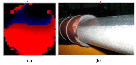 Reconstructed ECT image (a) and the photography that presents the material inside the pipe. (b) The red color shows the material inside the pipe, and the black color represents an empty part of the pipe. On the right hand, (b) the image of the pipe section is presented.