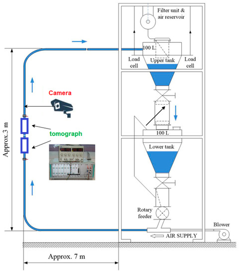 The research was based on a two-phase pneumatic gas-bulk material flow. The equipment configuration includes two 100 L tanks placed one below the other, a rotary feeder, a pump, piping in the horizontal section (2 × 7 m2) and vertical (approx. 3 m), as shown in Figure 6. Stainless steel piping was used with a diameter of Ø1 = 57 mm (inner). In the upper part of the installation, there is a filter that separates the phase of the loose material from the gaseous medium. A polymer granulate with a size of 3 mm × 3 mm × 1 mm and a dielectric permittivity of approximately 2.1 was adopted as the transported substance (Jaworski and Dyakowski 2001) [28].