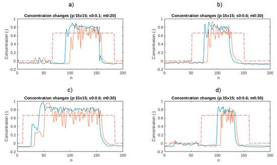 The second experiment was performed in order to visually estimate the signal time shifts (p) for successive plugs. Then, results were taken as reference values to calculate the root of mean square error (RMSE); Equation (7)) for the algorithm with respect to s0, m0.