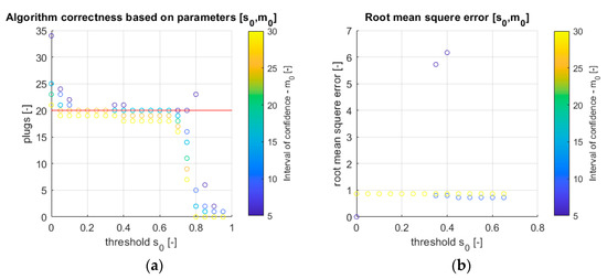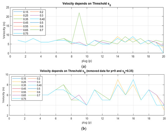 The discussed algorithm, together with arbitrarily set parameters, apparently indicates the correct speed estimates. However, there are situations when the obtained values are inconsistent with reality. One of the reasons for the occurrence of inappropriate estimates is the reliance on incorrect algorithm arguments. The analysis of the plug registration threshold s0 impact on the plugs identification algorithm effectiveness was performed. The results are presented in Figure 8a,b.