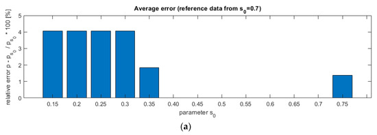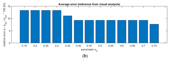 Plug identification algorithm threshold value impact on the velocity estimation accuracy. The plot on the top (a) shows the relative error for s0 = 0.7 as a reference (expected value). The relative error based on the visual analysis as a reference is shown beneath (b).