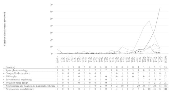 Figure 4 provides temporal information about the sub-category references relating to approaches of the cognitive-emotional dimension of architecture. The following should be noted: (1) the different approaches that have addressed the human-space relationship have enjoyed moments of greater popularity, and (2) neuroscience was applied to architecture later than to art and aesthetics. Both aspects suggest that including all the sub-categories helps address the issues that motivate this review.