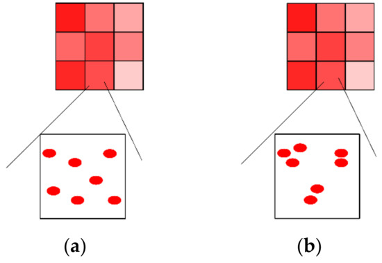 When using Equation (2) in aero-optical simulations, the difficulty is that the current mesh resolution of CFD cannot resolve the gradient of the refractive index. As shown in Figure 3, the grids with different transparencies represent the distribution of the refractive index that CFD mesh can resolve: the macro spatial density difference. When a grid is magnified, the distribution of air molecules can be observed, which is the micro-scale structure that the grid cannot resolve: the micro spatial density difference. The density difference is the main cause of aero-optical wavefront distortion [25]. CFD mesh can be applied to the case of uniform distribution, as shown in Figure 3a, but it will cause errors in the case shown in Figure 3b.