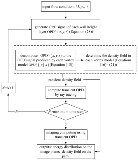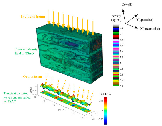 Molecules in the flow field are in high-speed movement. Large-scale structures are generally considered stable. The steady-state simulator [9] we designed, based on the steady-state hypothesis, simulates the aero-optical effects caused by large-scale structures. However, micro-scale structures are unsteady, so an aero-optical transient simulator (TSAO) is needed to simulate the high-dynamic distorted wavefront and the scattering process of the photon on its transmission path. There are two steps in the design of TSAO: transient distorted wavefront and transient density field, as shown in Figure 4. The transient distorted wavefront is designed by the scaling model. The transient density field is constructed by the artificial vortex structure.