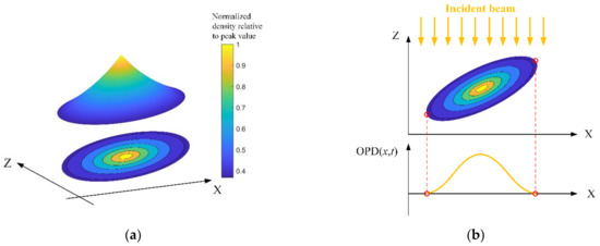 Layered-ellipse vortex model (X, streamwise; Z, wall direction): (a) Surface and projection of the layered-ellipse vortex model in two-dimensional density field; (b) parallel beam transmits through a layered-ellipse vortex and produces the optical path difference (OPD).