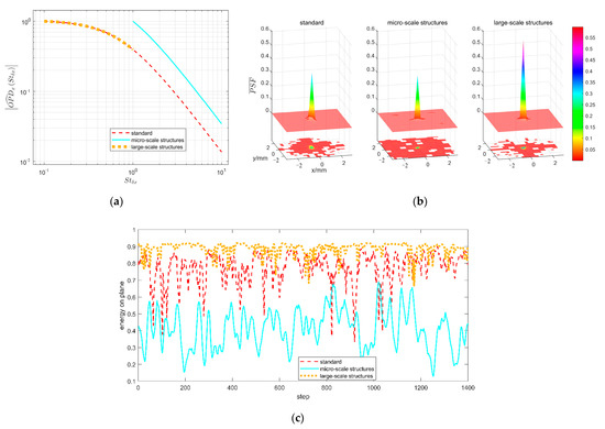 Figure 14 shows the simulation result of the point spread function (PSF) caused by different-sized density structures. The effect of micro-scale structures is reflected in the high-frequency OPD, while the effect of large-scale structures is reflected in the low-frequency OPD. Three different amplitude spectra of streamwise OPD are used as the scaling model in TSAO, as shown in Figure 14a, where the standard model is Equation (8). The amplitude spectra for micro- and large-scale structures are the high- and low-frequency parts of the standard model.