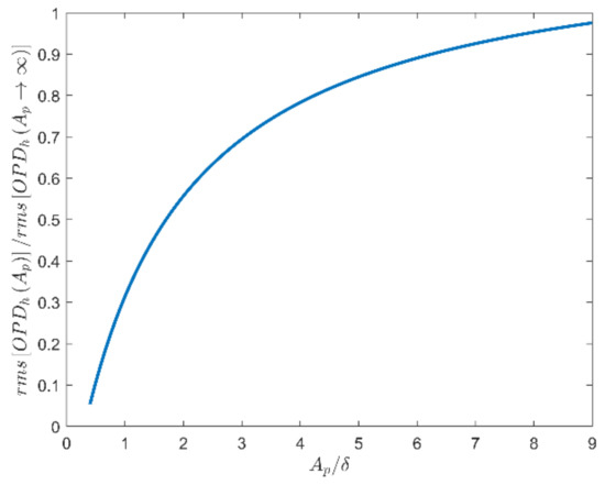 Figure 17 shows that the aperture effects of calculated by the one-dimensional OPD from TSAO are consistent with the theoretical model, and the variation trend is that with the increase in the relative aperture , tends to decay on the whole, but oscillates locally. The yellow dot-dash line in Figure 17 is , which is calculated using the two-dimensional OPD from TSAO. With the increase in the relative aperture , for the two-dimensional OPD gradually deviates from that of the one-dimensional traveling harmonic model, which was also found in [22] when analyzing data from wind tunnel experiments. The provided explanation was that the two-dimensional OPD is non-uniform in spanwise.