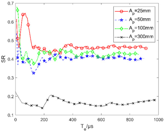 Under the flow condition given in Table 1, the SRs for different are plotted in Figure 19, where the results of different aperture sizes are also provided. The typical aperture size of a star sensor on a satellite at present is 25 mm; 50 and 100 mm mean doubling the aperture size constantly; other multiples of 25 mm can also be taken. = 300 mm corresponds to 10 multiples of the boundary layer thicknesses = 30 mm in TSAO. According to Figure 18, when > 10, reaches its maximum value. Thus, = 300 mm represents the condition of the maximum blurring component.