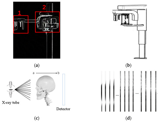 The traditional multifunctional oral CBCT device is shown in Figure 1a. It consists of a Lateral cranial imaging module (red box 1) and CBCT imaging module (red box 2). When taking a 3D image of the oral cavity, CBCT module is used to carry out the ring scan and then reconstruct this image on a computer. The patient needs to be moved to the lateral cranial module for repositioning during lateral cranial radiographs. This imaging strategy results in the cost of the equipment being expensive, as at least two sets of X-tube and flat plate detectors are required.