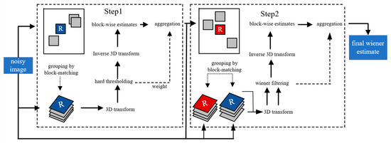 The image sequence needs to be de-noised before the image is stitched, mean filtering, median filtering, Gaussian filtering, and NL-Means algorithm are widely used denoising methods, and BM3D algorithm has excellent performance for denoising X-ray images among many denoising algorithms [29]. The BM3D algorithm was proposed by Dabov K et al. [30]. The flow chart of the BM3D algorithm is shown in Figure 4. It is generally divided into two steps; each step includes similar block grouping, collaborative filtering, and aggregation. The algorithm makes a basic estimate before making a final estimate of the image.