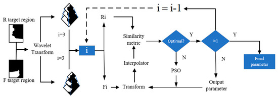 Image pyramid is a representation of the multi-scale image. An image pyramid is a set of images with different resolutions arranged in a pyramid shape. The bottom of the pyramid is a high-resolution representation of the image, while the top is a low-resolution approximation. In image registration, the multi-resolution strategy can not only shorten the registration time, but also reduce the influence of image noise on the registration results [31]. Wavelet transform has the characteristics of multi-resolution and has higher frequency resolution in the low-frequency part. The Wavelet transform of the two-dimensional image and the wavelet function is expressed as: