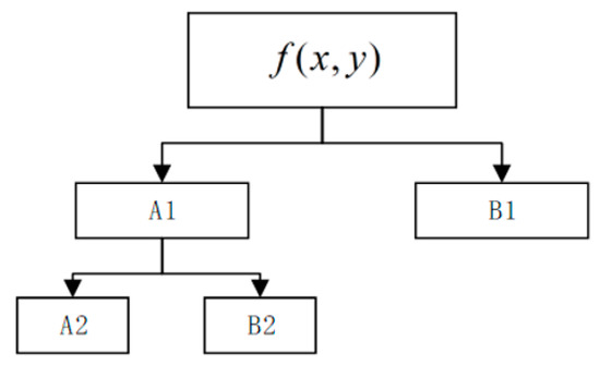 Two-layer wavelet decomposition is performed on the original image, as shown in Figure 8, to obtain the low-frequency part A1 and other B1 of the image. The low-frequency part A1 can retain the features of the source image, and then wavelet decomposition is performed on A1 to form an image pyramid composed of A2, A1, and the original image, as shown in Figure 9.