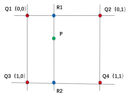 First, we interpolate the X and Y directions respectively to get two points, R1 and R2, and then we interpolate the points R1 and R2 to get the value of P, which is expressed as: