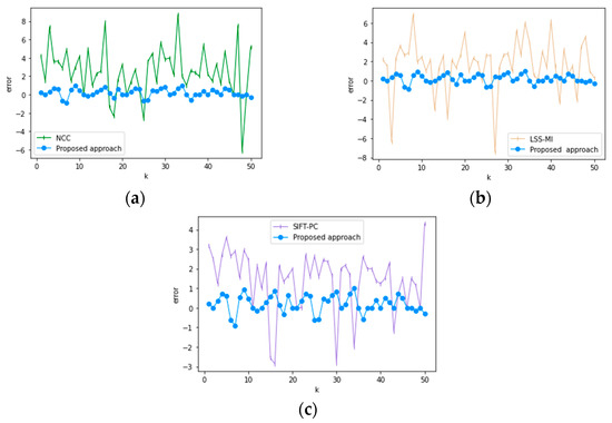 Statistical graph of registration error. (a) NCC and the proposed approach, (b) LSS-MI Comparison with the algorithm in this paper, (c) SIFT-PC and the algorithm in this paper.