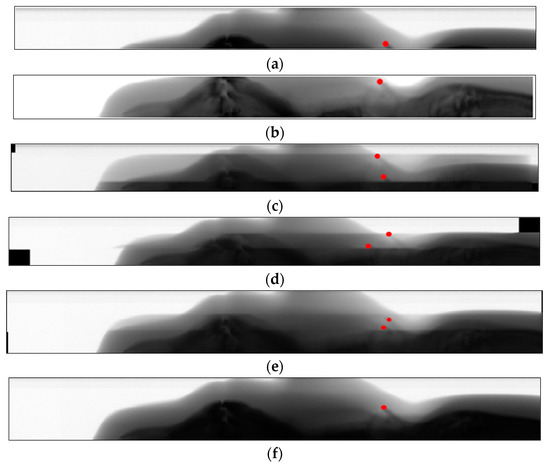 In order to directly observe the influence of registration error on image Mosaic, Figure 14a,b is selected to adopt the above registration method for image stitching. The same position of the two images is marked with red dots. Figure 14c,d and Figure 14e are respectively the panoramic images obtained by the above three registration algorithms, and it can be seen that the marking points do not overlap. Figure 14f is the panoramic image of the registration method in this paper, and the overlap of the marking points indicates that the estimation of registration parameters is accurate.